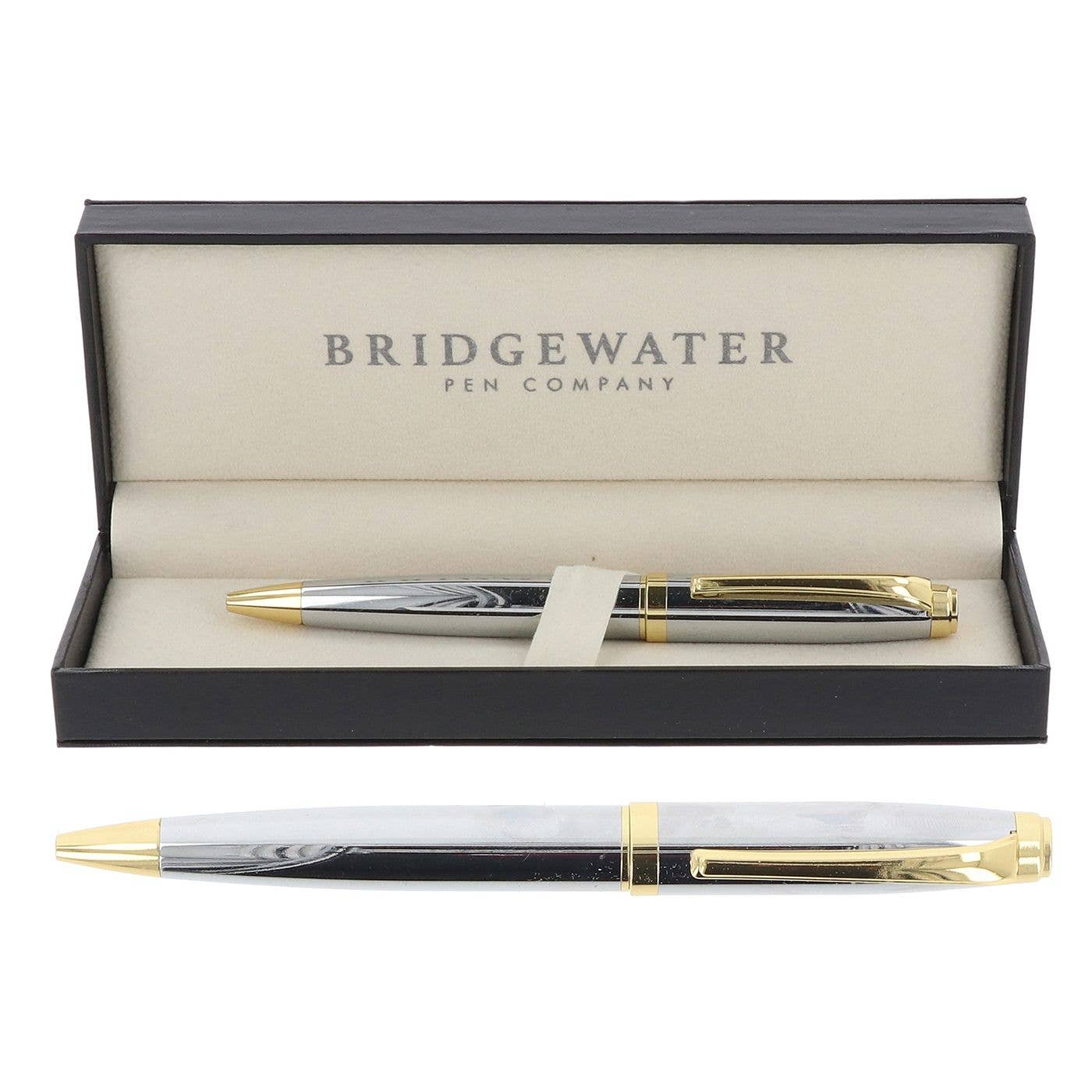 Discover the Bridgewater Chester Chrome & Gold Ball Pen at EngraveOn.ca. This elegant pen, featuring a refined chrome and gold design, is expertly engraved to offer a personalized touch. Perfect for adding sophistication to your desk or as a memorable gift for any occasion. Please note that online and in-store prices may vary.